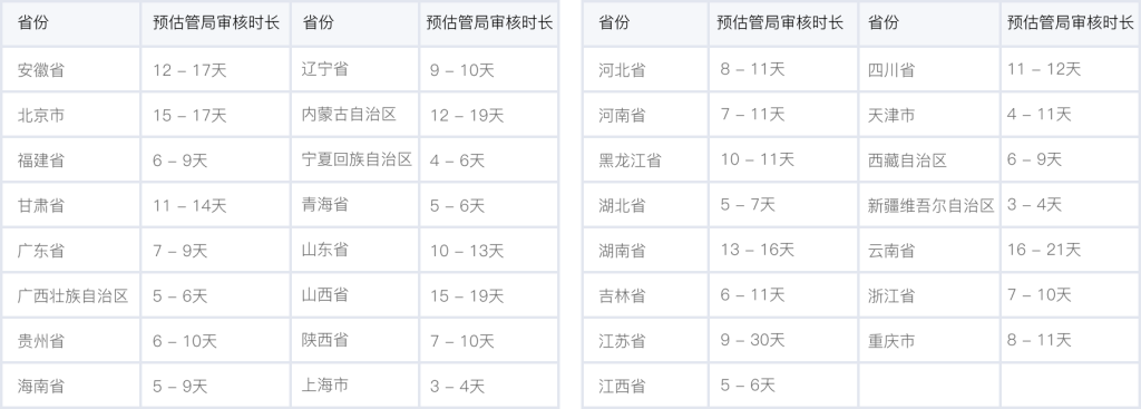 各個省管局預計審核時長,實際審核時長會根據(jù)備案場景有所不同,下表格僅供參考。詳情可查看 詳細規(guī)則。